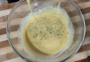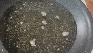 9. Heat the oil in a deep frying pan or wok over high heat.To test the oil, drop a little batter — if it rises up with bubbles, the oil is ready.