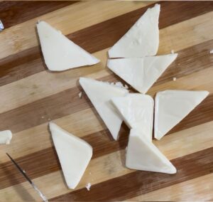5. Cut each cheese cube in 4 equal parts, Then give triangle shape to the prepared paneer.