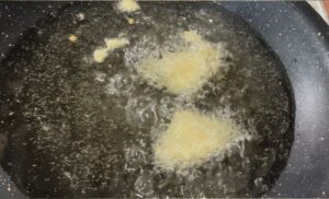 8.Now, gently slide or place each batter-coated cheese piece in the hot oil. Fry these on medium to medium-high heat.